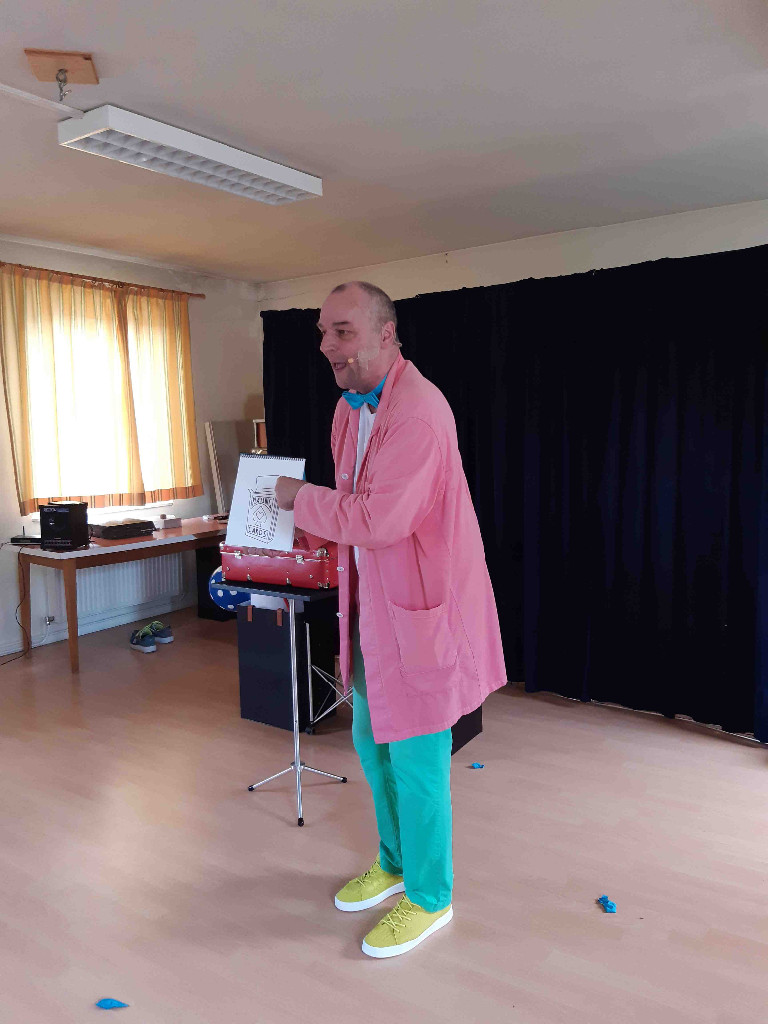 Werner Trinker als Zauberer Spooky-Doo hatte dieses Mal ein Zauberprogramm für Schüler im Gepäck! Spannend und unterhaltsam wars! Wie macht der das mit den Karten? Und wie kam der Schuh in den Luftballon? Jaja, manche Dinge werden ein Geheimnis bleiben, doch eines wurde gelüftet – ich glaube, etliche Kinder werden nun einen erhöhten Verbrauch an Gummiringerl haben.